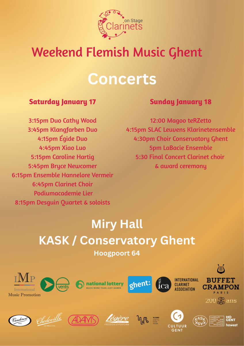 Tijdens Clarinets On Stage Weekend Flemish Music Ghent gaan er tal van concerten door in de Miry Zaal van het KASK/Conservatorium (Hoogpoort 64 - Gent). Deze concerten zijn gratis toegankelijk voor iedereen. We zien er naar uit om u te verwelkomen tijdens CLARINETS ON STAGE 2026!
